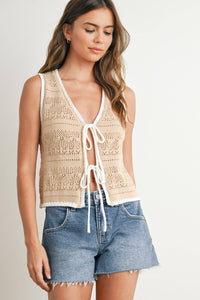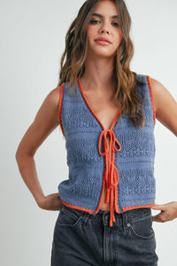Navy Tie Split-Hem Crewneck Long Sleeve Top