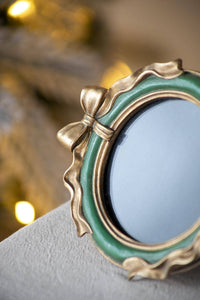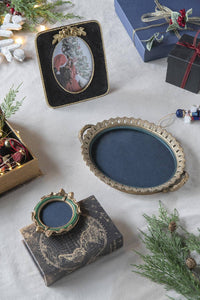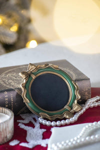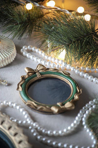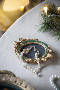 Indulge in the timeless elegance of the Elegant Jewel Rest Tray, a stunning addition to your vanity or dressing table. Crafted with a luxurious green and gold frame adorned with delicate bow accents, this ornate tray exudes sophistication and charm. Perfectly designed to cradle your cherished jewelry, it features a soft, dark velvet interior that gently cushions necklaces, bracelets, and rings. Set against a backdrop of festive pine and twinkling lights, this tray combines functionality with a touch of holiday magic, making it an ideal gift or a personal treat for the discerning beauty enthusiast.