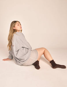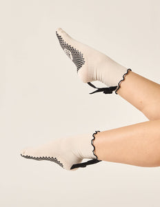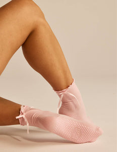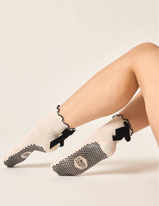 The Juliet Grip Sock Our perfectly pretty ribbed ruffle grip sock adorned with a satin bow at back of heel! Your new studio fav! The Features * Extra stick + grip like the honeycomb * Lightweight and breathable CoolMax fabric * Machine washable * Flexibly conforms to all your movements * One size fits all